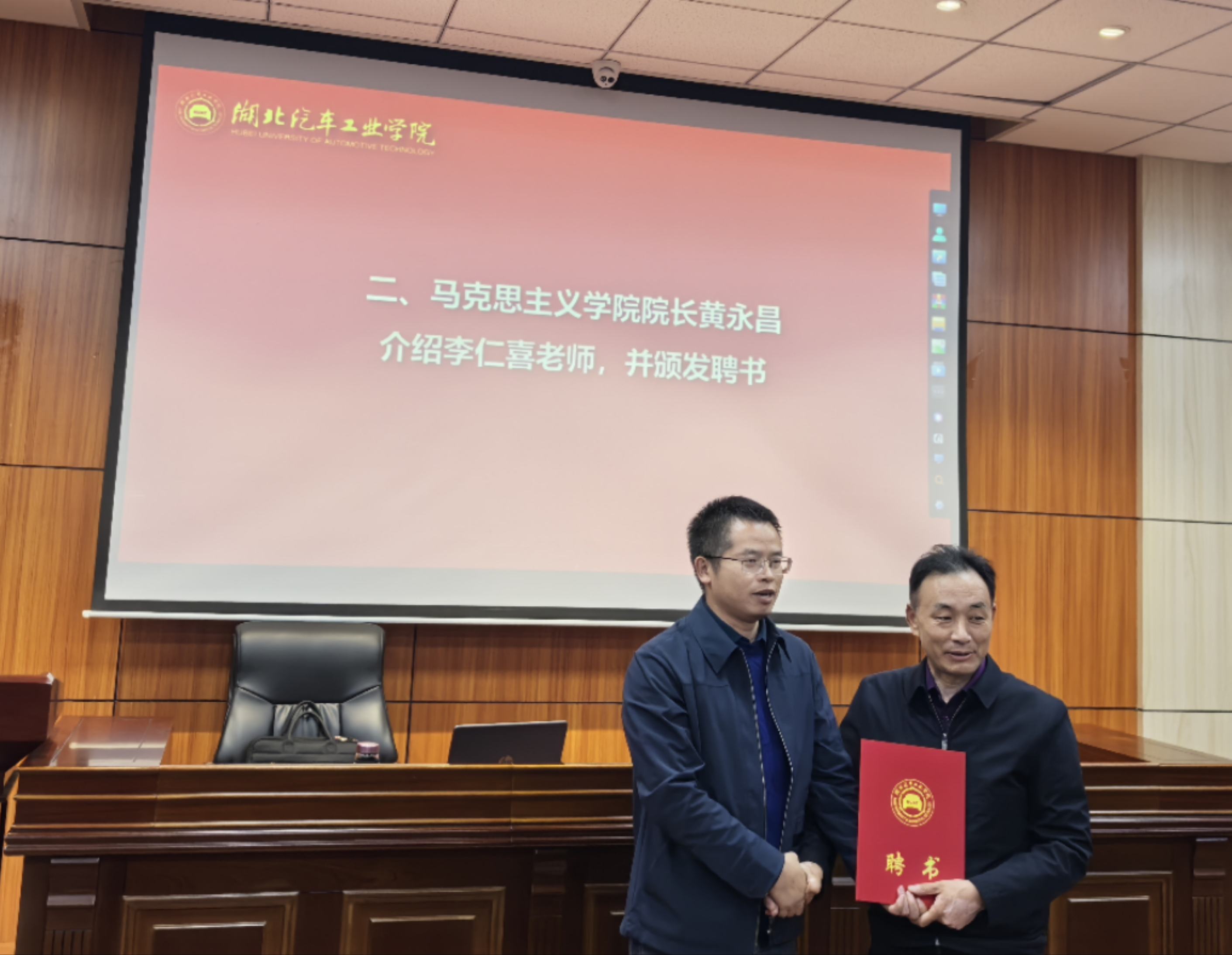 讲座前,成继平宣读了“76net必赢官网行走的大思政课活动方案”。李仁喜受聘为校外指导老师,黄永昌为李仁喜颁发聘书。